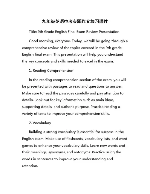 九年级英语中考专题作文复习课件Title: 9th Grade English Final Exam Review PresentationGood morning, everyone. Today, we will be going through a comprehensive review of the topics covered in the 9th grade English final exam. This presentation will help you understand the key concepts and skills needed to excel in the exam.1. Reading ComprehensionIn the reading comprehension section of the exam, you will be presented with passages to read and questions to answer. Make sure to read the passages carefully and pay attention to details. Look out for key information such as main ideas, supporting details, and author's purpose. Practice reading a variety of texts to improve your comprehension skills.2. VocabularyBuilding a strong vocabulary is essential for success in the English exam. Make use of flashcards, vocabulary lists, and word games to enhance your vocabulary skills. Learn new words and their meanings, synonyms, and antonyms. Practice using the words in sentences to improve your understanding and retention.3. GrammarGrammar is an important aspect of the English language, and you will be tested on various grammar rules in the exam. Review common grammar topics such as verb tenses,subject-verb agreement, pronouns, adjectives, and adverbs. Practice identifying errors in sentences and correcting them. Pay attention to punctuation rules and sentence structure as well.4. WritingThe writing section of the exam will test your ability to express ideas clearly and coherently. Practice writing essays, narratives, descriptive passages, and argumentative pieces. Pay attention to organization, coherence, and clarity in your writing. Use transition words and phrases to connect ideas smoothly. Proofread your work for grammar, spelling, and punctuation errors.5. SpeakingIn the speaking section of the exam, you may be asked to present a speech, participate in group discussions, or answer questions orally. Practice speaking English regularly to improve your fluency and pronunciation. Work on your intonation, stress, and rhythm to sound more natural in English. Engage inconversations with classmates, teachers, and native speakers to build confidence in speaking.6. ListeningThe listening section of the exam will test your ability to understand spoken English. Practice listening to different types of audio recordings such as conversations, interviews, lectures, and news reports. Focus on key details, main ideas, and supporting information. Take notes while listening to aid in comprehension.In conclusion, this review presentation covers the essential topics and skills needed for success in the 9th grade English final exam. Make use of the tips and strategies provided to improve your performance and achieve your desired results. Remember to practice regularly, seek help from teachers or peers, and stay focused and motivated. Good luck with your exam preparation! Thank you for your attention.。