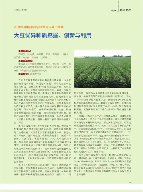 主要完成人:邱丽娟,常汝镇,韩英鹏,郭泰,李英慧,付亚书,关荣霞,朱振东,孙宾成,刘章雄主要完成单位:中国农业科学院作物科学研究所,东北农业大学,黑龙江省农业科学院佳木斯分院,黑龙江省农业科学院绥化分院,呼伦贝尔市农业科学研究所提名单位:农业农村部大豆是我国重要的植物油脂和蛋白质来源,也是重要的动物饲料来源。