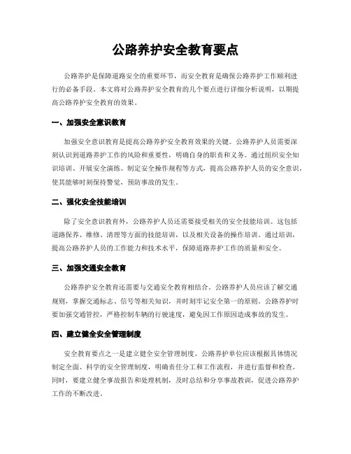 公路养护安全教育要点公路养护是保障道路安全的重要环节,而安全教育是确保公路养护工作顺利进行的必备手段。