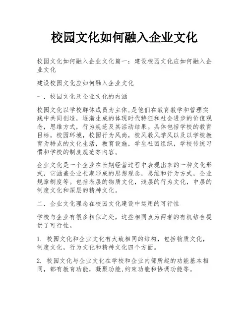 校园文化如何融入企业文化校园文化如何融入企业文化篇一:建设校园文化应如何融入企业文化建设校园文化应如何融入企业文化一.校园文化及企业文化的内涵校园文化以学校群体成员为主体,是他们在教育教学和管理实践中共同创造,逐渐生成的体现时代特征和社会进步的价值观念,思维方式,行为规范及其活动结果。
