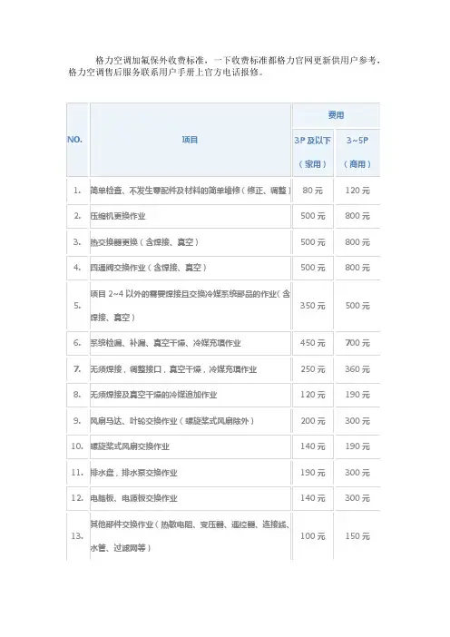 格力空调加氟保外收费标准,一下收费标准都格力官网更新供用户参考,注: 1、上述报价均不含零配件费用,耗材费用,高空费用,开顶费用等。