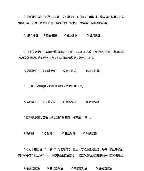 A .原始凭证 B.复合记账 C.借贷记账 D.通用凭证2.由于原始凭证不能清楚地表明应记入账户的名称和方向,为了便于记账,就有必要将原始凭证所反映的经济业务,加以归纳和整理,编制。