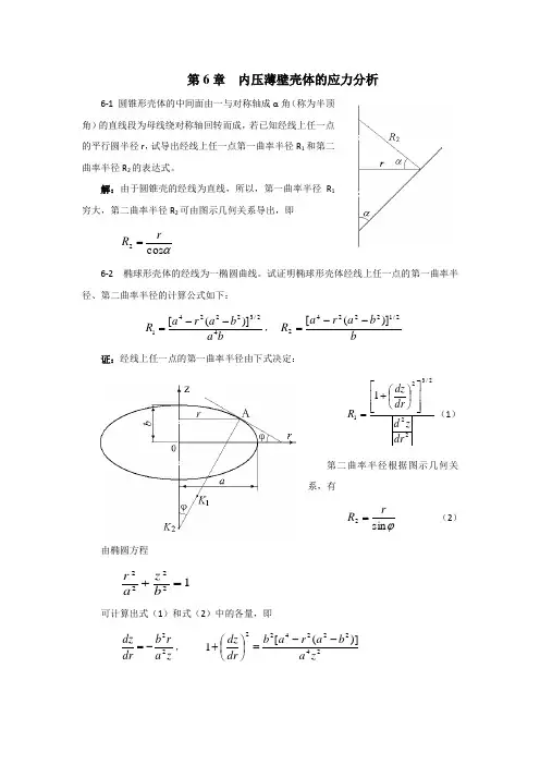 二、简述题1、 无力矩理论及无力矩理论应用条件?① 壳体的厚度、中面曲率和载荷连续,没有突变,且构成壳体的材料的物理性能相同。