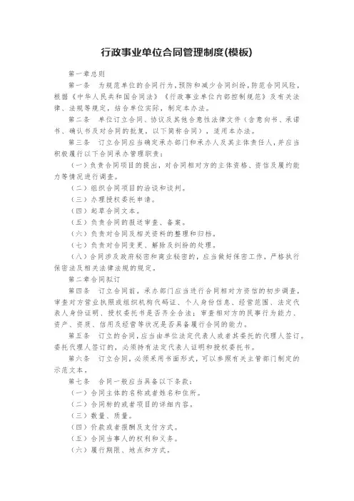 但我可以给出一个大致的行政事业单位合同管理制度的模板范本供您参考:行政事业单位合同管理制度第一章总则第一条目的与依据本制度是为了规范行政事业单位合同管理工作,加强合同的签订和履行,保障单位合法权益,提高合同管理水平。