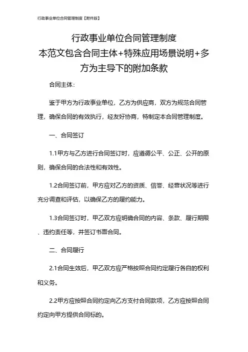 行政事业单位合同管理制度本范文包含合同主体+特殊应用场景说明+多方为主导下的附加条款合同主体:鉴于甲方为行政事业单位,乙方为供应商,双方为规范合同管理,确保合同的有效执行,经友好协商,特制定本合同管理制度。