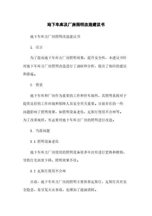 地下车库及厂房照明改造建议书尊敬的相关负责人:您好!随着社会的不断发展和进步,节能减排已经成为企业和社会关注的重要话题。