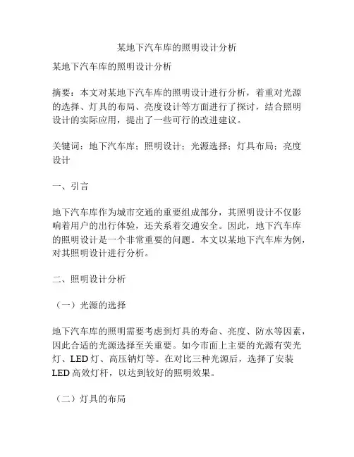 一、照明需求分析地下车库的照明需求主要包括以下几个方面:1. 安全性:车库内的照明应足够明亮,以确保车主和行人在夜间能够清晰地看到周围环境,避免事故发生。