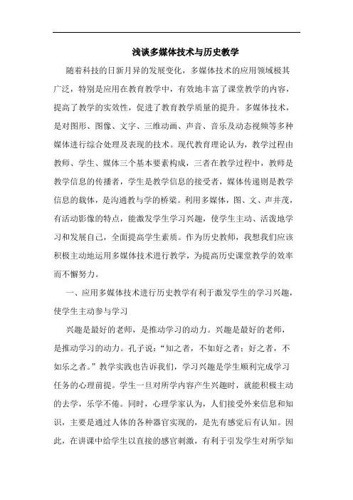 一、多媒体技术在历史课堂教学中运用的功效1、运用多媒体技术能够激发和强化学生学习的兴趣和学习的积极性。
