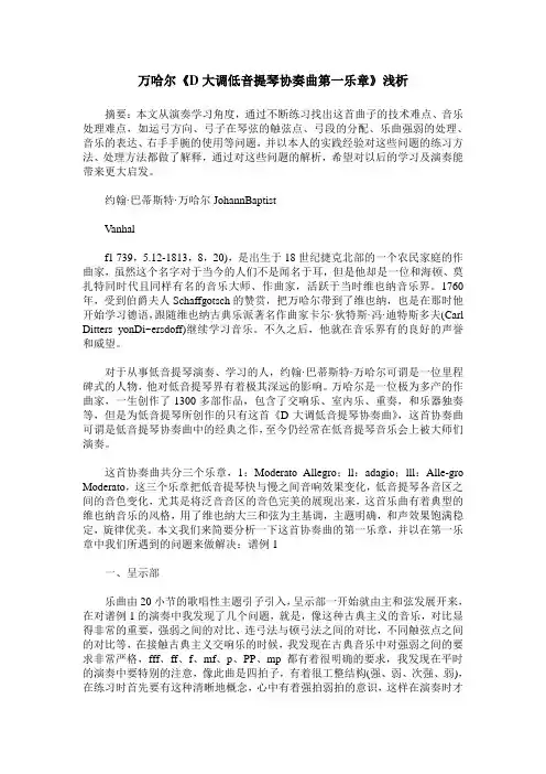 万哈尔《D大调低音提琴协奏曲第一乐章》浅析摘要:本文从演奏学习角度,通过不断练习找出这首曲子的技术难点、音乐处理难点,如运弓方向、弓子在琴弦的触弦点、弓段的分配、乐曲强弱的处理、音乐的表达、右手手腕的使用等问题,并以本人的实践经验对这些问题的练习方法、处理方法都做了解释,通过对这些问题的解析,希望对以后的学习及演奏能带来更大启发。