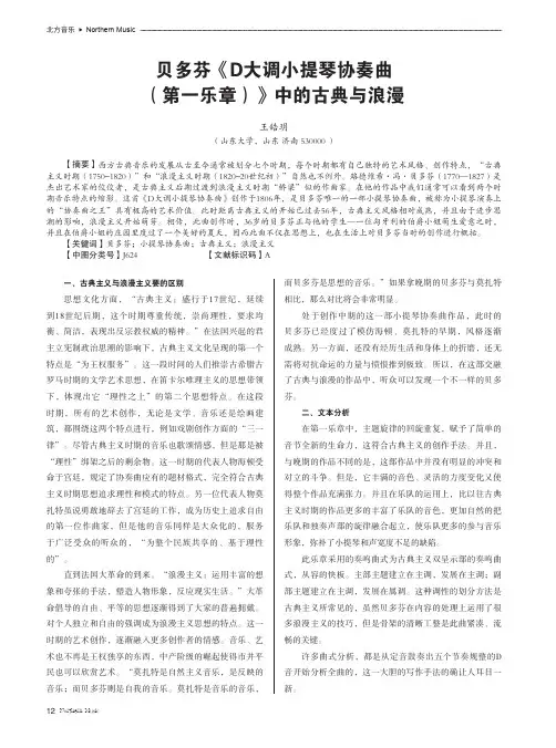 北方音乐Northern Music贝多芬《D大调小提琴协奏曲(第一乐章)》中的古典与浪漫王皓玥(山东大学,山东 济南 530000 )【摘要】西方古典音乐的发展从古至今通常被划分七个时期,每个时期都有自己独特的艺术风格、创作特点,“古典主义时期(1750~1820)”和“浪漫主义时期(1820~20世纪初)”自然也不例外。