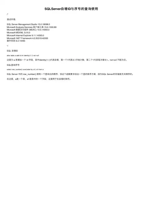 SQLServer中identity(⾃增)的⽤法详解⼀、identity的基本⽤法1.含义identity表⽰该字段的值会⾃动更新,不需要我们维护,通常情况下我们不可以直接给identity修饰的字符赋值,否则编译时会报错2.语法列名数据类型约束 identity(m,n)m表⽰的是初始值,n表⽰的是每次⾃动增加的值如果m和n的值都没有指定,默认为(1,1)要么同时指定m和n的值,要么m和n都不指定,不能只写其中⼀个值,不然会出错3.实例演⽰不指定m和n的值create table student1(sid int primary key identity,sname nchar(8) not null,ssex nchar(1))insert into student1(sname,ssex) values ('张三','男');insert into student1 values ('李四','⼥');--可以省略列名insert into student1 values ('王五','⼥');指定m和n的值create table student2(sid int primary key identity(20,5),sname nchar(8) not null,ssex nchar(1))insert into student2(sname,ssex) values ('张三','男');insert into student2 values ('李四','⼥');--可以省略列名insert into student2 values ('王五','⼥');4.删除⼀条记录接着插⼊把sid为2的记录删除,继续插⼊,新插⼊的记录的sid不是2,⽽是3create table student3(sid int primary key identity,sname nchar(8) not null,ssex nchar(1))insert into student3(sname,ssex) values ('张三','男');insert into student3 values ('李四','⼥');delete from student3 where sid=2;--把sid为2的记录删除insert into student3 values ('王五','⼥');⼆、重新设置identity的值1.语法dbcc checkident(表名,reseed,n);n+1表⽰的是表中identity字段的初始值(n的值可以为0)也就是说:如果插⼊的是id为2的记录,则n的值是12.实例演⽰create table student4(sid int primary key identity,sname nchar(8) not null,ssex nchar(1))insert into student4(sname,ssex) values ('张三','男');insert into student4 values ('李四','⼥');delete from student4 where sid=2;--把sid为2的记录删除dbcc checkident('student4',reseed,1);--把student4表中identity字段的初始值重新设置为1insert into student4 values ('王五','⼥');三、向identity字段插⼊数据1.语法set identity_insert 表名 on;insert into 表名(列名1,列名2,列名3,列名4) values (数据1,数据2,数据3,数据4);set identity_insert 表名 off;注意:插⼊数据时必须得指定identity修饰的字段的名字2.实例演⽰create table student5(sid int primary key identity(20,5),sname nchar(8) not null,ssex nchar(1))insert into student5(sname,ssex) values ('张三','男');insert into student5 values ('李四','⼥');insert into student5 values ('王五','⼥');set identity_insert student5 on;/*insert into student5 values ('⿊六','男');--errorinsert into student5 values (21,'⿊六','男');--error*/insert into student5(sid,sname,ssex) values (21,'⿊六','男');set identity_insert student5 off;/*insert into student5 values (22,'赵七','⼥');--errorinsert into student5(sid,sname,ssex) values (22,'赵七','⼥');--error*/insert into student5 values ('赵七','⼥');补充知识:SQL Server 添加与删除主键约束PRIMARY KEY 约束唯⼀标识数据库表中的每条记录。