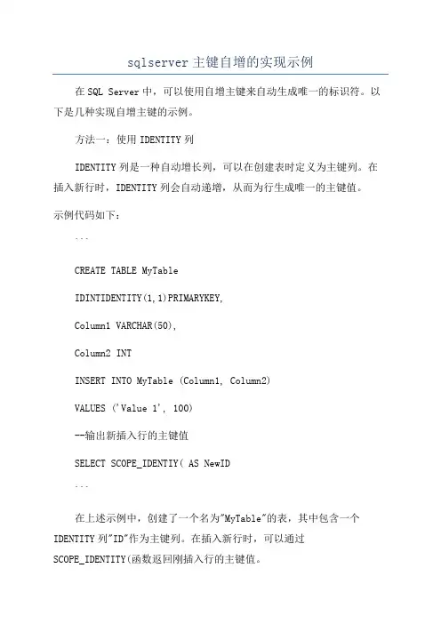 示例代码如下:```CREATE TABLE MyTableIDINTIDENTITY(1,1)PRIMARYKEY,Column1 VARCHAR(50),Column2 INTINSERT INTO MyTable (Column1, Column2)VALUES ('Value 1', 100)--输出新插入行的主键值SELECT SCOPE_IDENTIY( AS NewID```在上述示例中,创建了一个名为"MyTable"的表,其中包含一个IDENTITY列"ID"作为主键列。
