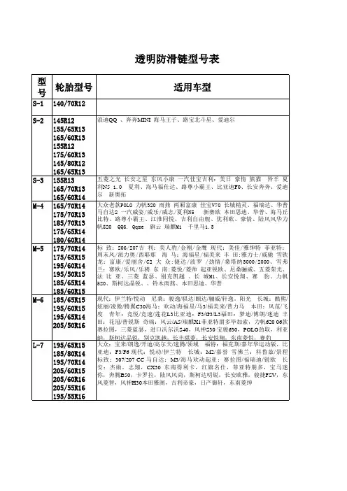 阳光长城:酷熊/炫丽/凌傲/腾翼C30海马:欢动/海福星/马3/福美来/普力马本田:风范/飞度青年:竞悦/竞速/莲花L3比亚迪:F3/G3/L3福田:梦迪/博朗/迷迪丰田:花冠/普锐斯奇瑞:风云/A5/瑞麒X1菲亚特朋多毕加索,力帆62006款赛拉图,三菱蓝瑟,进口沃尔沃S40,风神S30宝骏630,POLO劲取,利亚纳,斯柯达晶锐,别克凯越,长丰骐菱,长安悦翔,东南菱悦,赛豹L-7195/65R15185/80R14195/70R14205/60R15205/60R16205/55R16195/55R16大众:宝来/朗逸/开迪/高尔夫/速腾/领域福特:福克斯/嘉年华运动版,比亚迪:F3/F6现代:悦动/伊兰特长城:M2/嘉誉雪佛兰:科鲁兹/景程标致:307/207CC马自达:M3/海马欢动起亚:赛拉图/福瑞迪/锐欧长安:杰勋,志翔,CX30东南得利卡,红旗名仕,菲亚特朋多,宝马迷你,奔腾B50,卡罗拉,陆风风尚,斯柯达明锐,长安欧雅,骏捷FSV,东风菱智,风神H30本田雅阁,吉利帝豪,日产御轩,东南菱绅透明防滑链型号表高档透明黄120 120 130 135 135 140钢碗透明黄。