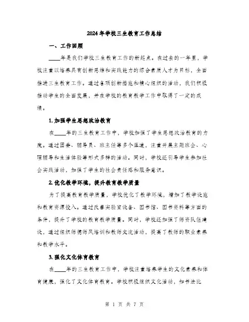 2024年学校三生教育工作总结范例近年来,随着社会的快速发展和学校教育的改革,学校三生教育工作逐渐受到重视。