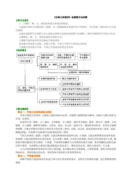 《立体几何初步》全章复习与巩固【学习目标】1.了解柱,锥,台,球及简单组合体的结构特征。