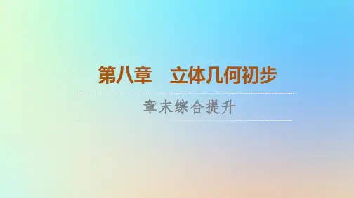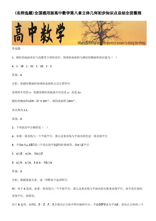(名师选题)全国通用版高中数学第八章立体几何初步知识点总结全面整理单选题1、圆柱的底面直径与高都等于球的直径,则球的表面积与圆柱的侧面积的比值为()A.1∶1B.1∶2C.2∶1D.2∶3答案:A分析:按圆柱侧面积和球的表面积公式计算即可.设球的半径的r,依题意圆柱的底面半径也是r,高是2r,圆柱的侧面积=2πr·2r=4πr2,球的表面积为4πr2,其比例为1:1,故选:A.2、下列说法中正确的是()A.如果一条直线与一个平面平行,那么这条直线与平面内的任意一条直线平行B.平面α内△ABC的三个顶点到平面β的距离相等,则α与β平行C.α//β,a//α,则a//βD.a//b,a//α,b⊄α,则b//α答案:D分析:根据线面关系,逐一判断每个选项即可.解:对于A选项,如果一条直线与一个平面平行,那么这条直线与平面内的无数条直线平行,而不是任意的直线平行,故错误;对于B选项,如图1,D,E,F,G分别为正方体中所在棱的中点,平面DEFG设为平面β,易知正方体的三个顶点A,B,C到平面β的距离相等,但△ABC所在平面α与β相交,故错误;对于选项C,a可能在平面β内,故错误;对于选项D,正确.故选:D.3、在下列判断两个平面α与β平行的4个命题中,真命题的个数是().①α、β都垂直于平面r,那么α∥β②α、β都平行于平面r,那么α∥β③α、β都垂直于直线l,那么α∥β④如果l、m是两条异面直线,且l∥α,m∥α,l∥β,m∥β,那么α∥βA.0B.1C.2D.3答案:D分析:在正方体中观察可判断①;由平面平行的传递性可判断②;由线面垂直的性质可判断③;根据面面平行判定定理可判断④.如图,易知在正方体中相邻两个侧面都垂直于底面,故①错误;由平面平行的传递性可知②正确;由线面垂直的性质可知③正确;过直线l做平面γ与α、β分别交于l1,l2,过直线m做平面χ与α、β分别交于m1,m2,因为l∥α,l∥β,所以l∥l1,l∥l2,所以l1∥l2因为l 1⊄β,l 2⊂β,所以l 1∥β同理,m 1∥β又l 、m 是两条异面直线,所以l 1,l 2相交,且l 1⊂α,m 1⊂α所以α∥β,故④正确.故选:D4、如图,在梯形ABCD 中,AB ∥DC 且AB =2DC ,点E 为线段BC 的靠近点C 的一个四等分点,点F 为线段AD 的中点,AE 与BF 交于点O ,且AO ⃑⃑⃑⃑⃑ =xAB⃑⃑⃑⃑⃑ +yBC ⃑⃑⃑⃑⃑ ,则x +y 的值为( )A .1B .57C .1417D .56 答案:C分析:由向量的线性运算法则化简得到AO ⃑⃑⃑⃑⃑ ==(x −y 2)AB ⃑⃑⃑⃑⃑ +2yAF ⃑⃑⃑⃑⃑ 和BO ⃑⃑⃑⃑⃑ =(1−x)BA ⃑⃑⃑⃑⃑ +4y 3BE ⃑⃑⃑⃑⃑ ,结合B,O,F 三点共线和A,O,E 三点共线,得出2x +3y −2=0和3x −4y =0,联立方程组,即可求解.根据向量的线性运算法则,可得AO⃑⃑⃑⃑⃑ =xAB ⃑⃑⃑⃑⃑ +yBC ⃑⃑⃑⃑⃑ =xAB ⃑⃑⃑⃑⃑ +y(BA ⃑⃑⃑⃑⃑ +AC ⃑⃑⃑⃑⃑ ) =xAB ⃑⃑⃑⃑⃑ −yAB ⃑⃑⃑⃑⃑ +yAC ⃑⃑⃑⃑⃑ =(x −y)AB ⃑⃑⃑⃑⃑ +y ⋅(AD ⃑⃑⃑⃑⃑ +DC⃑⃑⃑⃑⃑ ) =(x −y)AB ⃑⃑⃑⃑⃑ +y ⋅(2AF ⃑⃑⃑⃑⃑ +12AB ⃑⃑⃑⃑⃑ )=(x −y)AB ⃑⃑⃑⃑⃑ +2yAF ⃑⃑⃑⃑⃑ +12yAB ⃑⃑⃑⃑⃑ =(x −y 2)AB ⃑⃑⃑⃑⃑ +2yAF ⃑⃑⃑⃑⃑ ,因为B,O,F 三点共线,可得x −y 2+2y =1,即2x +3y −2=0; 又由BO ⃑⃑⃑⃑⃑ =BA ⃑⃑⃑⃑⃑ +AO ⃑⃑⃑⃑⃑ =BA ⃑⃑⃑⃑⃑ +xAB ⃑⃑⃑⃑⃑ +yBC ⃑⃑⃑⃑⃑ =BA ⃑⃑⃑⃑⃑ −xBA ⃑⃑⃑⃑⃑ +y ⋅43BE ⃑⃑⃑⃑⃑ =(1−x)BA ⃑⃑⃑⃑⃑ +4y 3BE ⃑⃑⃑⃑⃑ , 因为A,O,E 三点共线,可得1−x +4y 3=1,即3x −4y =0,联立方程组{2x +3y −2=03x −4y =0,解得x =817,y =617,所以x +y =1417. 故选:C.5、紫砂壶是中国特有的手工陶土工艺品,经典的有西施壶,石瓢壶,潘壶等,其中石瓢壶的壶体可以近似看成一个圆台,如图给了一个石瓢壶的相关数据(单位:cm ),那么该壶的容积约为( )A .100cm 3B .200cm 3C .300cm 3D .400cm 3答案:B分析:根据题意可知圆台上底面半径为3,下底面半径为5,高为4,由圆台的结构可知该壶的容积为大圆锥的体积减去小圆锥的体积,设大圆锥的高为ℎ,所以ℎ−4ℎ=610,求出ℎ的值,最后利用圆锥的体积公式进行运算,即可求出结果.解:根据题意,可知石瓢壶的壶体可以近似看成一个圆台,圆台上底面半径为3,下底面半径为5,高为4,可知该壶的容积为大圆锥的体积减去小圆锥的体积,设大圆锥的高为ℎ,所以ℎ−4ℎ=610,解得:ℎ=10, 则大圆锥的底面半径为5,高为10,小圆锥的底面半径为3,高为6,所以该壶的容积V =13×π×52×10−13×π×32×6=1963π≈200cm 3.故选:B.6、已知正四棱锥的底面边长为6,侧棱长为5,则此棱锥的侧面积为( )A .6B .12C .24D .48答案:D分析:首先由勾股定理求出斜高,即可求出侧面积;解:正四棱锥的底面边长为6,侧棱长为5,则其斜高ℎ′=√52−(62)2=4,所以正四棱锥的侧面积S =12×4×6×4=48故选:D7、在空间中,下列命题是真命题的是( )A .经过三个点有且只有一个平面B .平行于同一平面的两直线相互平行C .如果两个角的两条边分别对应平行,那么这两个角相等D .如果两个相交平面垂直于同一个平面,那么它们的交线也垂直于这个平面答案:D分析:由三点共线判断A ;由线面、线线位置关系判断B ;根据等角定理判断C ;由线面平行和垂直的判定以及性质判断D.当三点在一条直线上时,可以确定无数个平面,故A 错误;平行于同一平面的两直线可能相交,故B 错误;由等角定理可知,如果两个角的两条边分别对应平行,那么这两个角相等或互补,故C错误;如果两个相交平面α,β垂直于同一个平面γ,且α∩β=l,则在平面α、β内分别存在直线m,n垂直于平面γ,由线面垂直的性质可知n//m,再由线面平行的判定定理得m//β,由线面平行的性质得出m//l,则l⊥γ,故D 正确;故选:D8、鲁班锁(