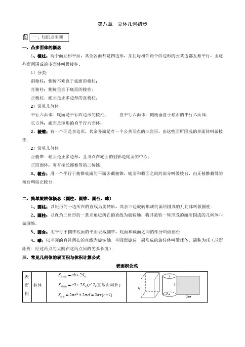 第八章立体几何初步一、凸多面体的概念1、棱柱:两个面互相平面,其余各面都是四边形,并且每相邻两个四边形的公共边都互相平行,由这些面所围成的多面体叫做棱柱.1)分类:斜棱柱:侧棱不垂直于底面的棱柱;直棱柱:侧棱垂直于底面的棱柱;正棱柱:底面是正多边形的直棱柱;2)常见几何体平行六面体:底面是平行四边形的棱柱;直平行六面体:侧棱垂直于底面的平行六面体;长方体:底面是矩形的直平行六面体;2、棱锥:有一个面是多边形,其余各面是有一个公共顶点的三角形,由这些面所围成的多面体叫做棱锥.2)常见几何体正棱锥:底面是正多边形,且顶点在底面的射影是底面的中心;正四面体:所有棱长都相等的三棱锥.3、棱台:用一个平行于棱锥底面的平面去截棱锥,底面和截面之间的部分叫做棱台,由正棱锥截得的棱台叫做正棱台.二、简单旋转体概念(圆柱、圆锥、圆台、球)1、圆柱:以矩形的一边所在的直线为旋转轴,其余三边旋转形成的面所围成的几何体叫做圆柱.2、圆柱:以直角三角形的一条直角边所在的直线为旋转轴,将其旋转一周形成的面所围成的几何体叫做圆锥.3、圆台:用平行于圆锥底面的平面去截圆锥,底面和截面之间的部分叫做圆台.4、球:以半圆的直径所在的直线为旋转轴,半圆面旋转一周形成的旋转体叫做球体,简称为球(球面距离:经过两点的大圆在这两点间的劣弧长度).三、常见几何体的表面积与体积计算公式表面积公式表面积柱体2直棱柱底=+S ch S2(斜棱柱底''=+S c l S c为直截面周长)2222()圆锥=+=+S r rl r r lπππ一、知识点明晰体积公式四、空间几何体的直观图1、斜二测画法(主要步骤如下)1)建立直角坐标系.在已知水平放置的平面图形中取互相垂直的Ox ,Oy ,建立直角坐标系. 2)画出斜坐标系.在画直观图的纸上(平面上)画出对应图形.在已知图形平行于x 轴的线段,在直观图中画成平行于''O x ,''O y ,使45'''∠=x O y (或135),它们确定的平面表示水平平面.3)画出对应图形.在已知图形平行于x 轴的线段,在直观图中画成平行于'x 轴的线段,且长度保持不变;在已知图形平行于y轴的线段,在直观图中画成平行于'y轴,且长度变为原来的一般.可简化为“横不变,纵减半”.4)擦去辅助线.图画好后,要擦去'x轴、'y轴及为画图添加的辅助线(虚线).被挡住的棱画虚线.2、常用结论:1)直观图和平面图形的面积比为S=原直。