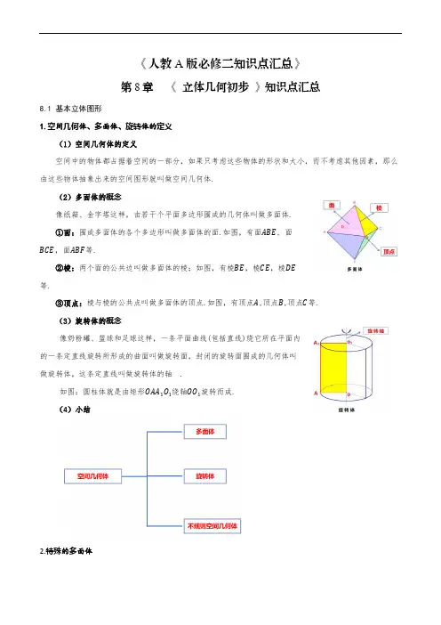 《人教A版必修二知识点汇总》第8章《立体几何初步》知识点汇总8.1 基本立体图形1.空间几何体、多面体、旋转体的定义(1)空间几何体的定义空间中的物体都占据着空间的一部分,如果只考虑这些物体的形状和大小,而不考虑其他因素,那么由这些物体抽象出来的空间图形就叫做空间几何体.(2)多面体的概念像纸箱、金字塔这样,由若干个平面多边形围成的几何体叫做多面体.①面:围成多面体的各个多边形叫做多面体的面.如图,有面ABE, 面BCE,面ABF等.②棱:两个面的公共边叫做多面体的棱;如图,有棱BE,棱CE,棱DE等.③顶点:棱与棱的公共点叫做多面体的顶点.如图,有顶点A,顶点B,顶点C等.(3)旋转体的概念像奶粉罐、篮球和足球这样,一条平面曲线(包括直线)绕它所在平面内的一条定直线旋转所形成的曲面叫做旋转面,封闭的旋转面围成的几何体叫做旋转体,这条定直线叫做旋转体的轴 .如图:圆柱体就是由矩形OAA1O1绕轴OO1旋转而成.(4)小结2.特殊的多面体(1)棱柱①棱柱的概念与结构特征如图,一般地,有两个面互相平行,其余各面都是四边形,并且相邻两个四边形的公共边都互相平行,由这些面所围成的多面体叫做棱柱.Ⅰ.底面(底):两个互相平行的面叫做棱柱的底面,它们是全等的多边形.Ⅱ.侧面:其余各面叫做棱柱的侧面,它们都是平行四边形.Ⅲ.侧棱:相邻侧面的公共边叫做棱柱的侧棱,它们都是相互平行且相等的线段.Ⅳ.顶点:侧面与底面的公共顶点叫做棱柱的顶点.温馨提示A.两个底面与平行于底面的截面是全等的多边形,如图(a)所示;B.过不相邻的两条侧棱的截面是平行四边形,如图(b)所示;C.有两个面平行,其余各面都是平行四边形的几何体不一定是棱柱,如图(c)所示.②棱柱的表示与分类棱柱用表示底面各顶点的字母来表示,棱柱的底面可以是三角形、四边形、五边形……,我们把这样的棱柱分别叫做三棱柱、四棱柱、五棱柱……例如,右图中的棱柱分别表示为三棱柱ABC−A1B1C1,四棱柱ABCD−A1B1C1D1,五棱柱ABCDE−A1B1C1D1E1.③几种特殊的棱柱Ⅰ.直棱柱:一般地,我们把侧棱垂直于底面的棱柱叫做直棱柱.如右图中直四棱柱ABCD−A1B1C1D1.Ⅱ.斜棱柱:侧棱不垂直于底面的棱柱叫做斜棱柱.如右图中斜三棱柱ABC−A1B1C1.Ⅲ.正棱柱:底面是正多边形的直棱柱叫做正棱柱.如右图中五棱柱ABCDE−A1B1C1D1E1.Ⅳ.平行六面体:底面是平行四边形的四棱柱也叫做平行六面体.如右图中平行六面体ABCD−A1B1C1D1.(2)棱锥①棱锥的概念与结构特征有一个面是多边形,其余各面都是有一个公共顶点的三角形,由这些面所围成的多面体叫做棱锥.Ⅰ.底面:这个多边形面叫做棱锥的底面;Ⅱ.侧面:有公共顶点的各个三角形面叫做棱锥的侧面;Ⅲ.侧棱:相邻侧面的公共边叫做棱锥的侧棱;Ⅳ.顶点:各侧面的公共顶点叫做棱锥的顶点.温馨提示:对于棱锥要注意,有一个面是多边形,其余各面都是三角形的几何体不一定是棱锥,如图所示,必须强调其余各面是具有公共顶点的三角形.②棱锥的表示与分类棱锥用表示顶点和底面各顶点的字母来表示,棱锥的底面可以是三角形、四边形、五边形……,我们把这样的棱锥分别叫做三棱锥、四棱锥、五棱锥……注:其中三棱锥又叫四面体.例如,右图中的棱锥分别表示为三棱锥(四面体)O−ABC,四棱锥O−ABCD,五棱锥O−ABCDE.③特殊的棱锥——正棱锥底面是正多边形,并且顶点与底面中心的连线垂直于底面的棱锥叫做正棱锥.(3)棱台①棱台的概念与结构特征用一个平行于棱锥底面的平面去截棱锥,底面和截面之间的那部分多面体叫做棱台.Ⅰ.上(下)底面:在棱台中,原棱锥的底面和截面分别叫做棱台的下底面和上底面,且上下底面是相似图形.Ⅱ.侧面:其余各个梯形面叫做棱台的侧面;Ⅲ.侧棱:相邻侧面的公共边叫做棱台的侧棱;Ⅳ.顶点:侧面与底面的公共顶点叫做棱台的顶点.温馨提示:棱台中各侧棱延长后必相交于一点,否则不是棱台.②棱台的表示与分类棱台用表示底面各顶点的字母来表示,由三棱锥、四棱锥、五棱锥……截得的棱台分别叫做三棱台、四棱台、五棱台……例如,右图中的棱台分别表示为三棱台ABC−A1B1C1,四棱台ABCD−A1B1C1D1,五棱锥ABCDE−A1B1C1D1E1.3.特殊的旋转体(1)圆柱以矩形的一边所在直线为旋转轴,其余三边旋转一周形成的面所围成的旋转体叫做圆柱.①轴:旋转轴叫做圆柱的轴;②底面:垂直于轴的边旋转而成的圆面叫做圆柱的底面;③侧面:平行于轴的边旋转而成的曲面叫做圆柱的侧面;④母线:无论旋转到什么位置,平行于轴的边都叫做圆柱的母线.注:圆柱用表示它的轴的字母表示,如图中的圆柱记作圆柱O1O.(2)圆锥以直角三角形的一条直角边所在直线为旋转轴,其余两边旋转一周形成的面所围成的旋转体叫做圆锥.①轴:旋转轴叫做圆锥的轴;②底面:垂直于轴的边旋转而成的圆面叫做圆锥的底面;③侧面:直角三角形的斜边旋转而成的曲面叫做圆锥的侧面;④母线:无论旋转到什么位置,不垂直于轴的边都叫做圆锥的母线.注:圆锥用表示它的轴的字母表示,如图中的圆锥记作圆锥SO.(3)圆台用平行于圆锥底面的平面去截圆锥,底面与截面之间的部分叫做圆台.①轴:旋转轴叫做圆台的轴;②底面:垂直于轴的边旋转而成的圆面叫做圆台的底面;③侧面:不垂直于轴的边旋转一周所形成的曲面叫做圆台的侧面;④母线:无论旋转到什么位置,不垂直于轴的边都叫做圆台的母线.注:圆台用表示它的轴的字母表