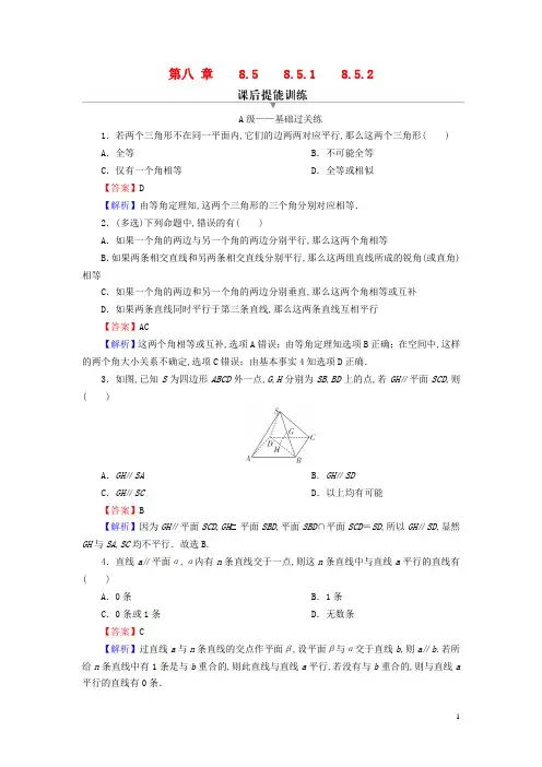 第八章 8.5 8.5.1 8.5.2A级——基础过关练1.若两个三角形不在同一平面内,它们的边两两对应平行,那么这两个三角形( ) A.全等B.不可能全等C.仅有一个角相等D.全等或相似【答案】D【解析】由等角定理知,这两个三角形的三个角分别对应相等.2.(多选)下列命题中,错误的有( )A.如果一个角的两边与另一个角的两边分别平行,那么这两个角相等B.如果两条相交直线和另两条相交直线分别平行,那么这两组直线所成的锐角(或直角)相等C.如果一个角的两边和另一个角的两边分别垂直,那么这两个角相等或互补D.如果两条直线同时平行于第三条直线,那么这两条直线互相平行【答案】AC【解析】这两个角相等或互补,选项A错误;由等角定理知选项B正确;在空间中,这样的两个角大小关系不确定,选项C错误;由基本事实4知选项D正确.3.如图,已知S为四边形ABCD外一点,G,H分别为SB,BD上的点,若GH∥平面SCD,则( )A.GH∥SA B.GH∥SDC.GH∥SC D.以上均有可能【答案】B【解析】因为GH∥平面SCD,GH⊂平面SBD,平面SBD∩平面SCD=SD,所以GH∥SD,显然GH与SA,SC均不平行.故选B.4.直线a∥平面α,α内有n条直线交于一点,则这n条直线中与直线a平行的直线有( )A.0条B.1条C.0条或1条D.无数条【答案】C【解析】过直线a与n条直线的交点作平面β,设平面β与α交于直线b,则a∥b.若所给n条直线中有1条是与b重合的,则此直线与直线a平行,若没有与b重合的,则与直线a 平行的直线有0条.5.梯形ABCD中,AB∥CD,AB⊂平面α,CD⊄平面α,则直线CD与平面α的位置关系是________.【答案】平行【解析】因为AB∥CD,AB⊂平面α,CD⊄平面α,由线面平行的判定定理可得CD∥α.6.给出下列四个命题,其中正确命题的序号是________.①在空间,若两条直线不相交,则它们一定平行;②平行于同一条直线的两条直线平行;③一条直线和两条平行直线的一条相交,那么它也和另一条相交;④空间四条直线a,b,c,d,如果a∥b,c∥d,且a∥d,那么b∥c.【答案】②④【解析】①错,可以异面;②正确,基本事实4;③错误,和另一条可以异面;④正确,由平行直线的传递性可知.7.如图,在正方体ABCD-A1B1C1D1中,BD和B1D1分别是正方形ABCD和A1B1C1D1的对角线.(1)∠DBC的两边与________的两边分别平行且方向相同;(2)∠DBC的两边与________的两边分别平行且方向相反.【答案】(1)∠D1B1C1(2)∠B1D1A1【解析】(1)因为B1D1∥BD,B1C1∥BC且方向相同,所以∠DBC的两边与∠D1B1C1的两边分别平行且方向相同.(2)B1D1∥BD,D1A1∥BC且方向相反,所以∠DBC的两边与∠B1D1A1的两边分别平行且方向相反.8.如图,已知在棱长为a的正方体ABCD-A1B1C1D1中,M,N分别是棱CD,AD的中点.求证:(1)四边形MNA1C1是梯形;(2)∠DNM=∠D1A1C1.证明:(1)如图,连接AC.因为在△ACD中,M,N分别是CD,AD的中点,所以MN是△ACD的中位线.所以MN ∥AC ,MN =12AC .由正方体的性质得AC ∥A 1C 1,AC =A 1C 1.所以MN ∥A 1C 1,且MN =12A 1C 1,即MN ≠A 1C 1.所以四边形MNA 1C 1是梯形. (2)由(1)可知MN ∥A 1C 1.又因为ND ∥A 1D 1,所以∠DNM 与∠D 1A 1C 1相等或互补. 而∠DNM 与∠D 1A 1C 1均为锐角, 所以∠DNM =∠D 1A 1C 1.9.如图,在正方体ABCD -A 1B 1C 1D 1中,E ,F 分别是棱BC ,C 1D 1的中点,求证:EF ∥平面BDD 1B 1.证明:如图,取D 1B 1的中点O ,连接OF ,OB .因为OF 綉12B 1C 1,BE 綉12B 1C 1,所以OF 綉BE .所以四边形OFEB 是平行四边形. 所以EF ∥BO .因为EF ⊄平面BDD 1B 1,BO ⊂平面BDD 1B 1,所以EF ∥平面BDD 1B 1.B 级——能力提升练10.如图所示,在空间四边形ABCD 中,E ,F ,G ,H 分别是AB ,BC ,CD ,DA 上的点,EH ∥FG ,则EH 与BD 的位置关系是( )A .平行B .相交C .异面D .不确定【答案】A【解析】因为EH ∥FG ,FG ⊂平面BCD ,EH ⊄平面BCD ,所以EH ∥平面BCD .因为EH ⊂平面ABD ,平面ABD ∩平面BCD =BD ,所以EH ∥BD .11.(2021年武汉模拟)对于直线m ,n 和平面α,下面命题中的真命题是( ) A .如果m ⊂α,n ⊄α,m ,n 是异面直线,那么n ∥α B .如果m ⊂α,n 与α相交,那么m ,n 是异面直线 C .如果m ⊂α,n ∥α,m ,n 共面,那么m ∥n D .如果m ∥α,n ∥α,m ,n 共面,那么m ∥n 【答案】C【解析】对于A,如果m ⊂α,n ⊄α,m ,n 是异面直线,则n ∥α或n 与α相交,故A 错误;对于B,如果m ⊂α,n 与α相交,则m ,n 相交或是异面直线,故B 错误;对于C,如果m ⊂α,n ∥α,m ,n 共面,由线面平行的性质定理,可得m ∥n ,故C 正确;对于D,如果m ∥α,n ∥α,m ,n 共面,则m ∥n 或m ,n 相交,故D 错误.12.如图,四棱锥S -ABCD 的所有的棱长都等于2,E 是SA 的中点,过C ,D ,E 三点的平面与SB 交于点F ,则四边形DEFC 的周长为( )A .2+ 3B .3+ 3C .3+2 3D .2+2 3【答案】C【解析】由AB =BC =CD =DA =2,得AB ∥CD ,即AB ∥平面DCFE ,∵平面SAB ∩平面DCFE =EF ,∴AB ∥EF .∵E 是SA 的中点,∴EF =1,DE =CF = 3.∴四边形DEFC 的周长为3+2 3.13.(多选)如图所示,在四面体ABCD 中,M ,N ,P ,Q ,E 分别是AB ,BC ,CD ,AD ,AC 的中点,则下列说法正确的是( )A .M ,N ,P ,Q 四点共面B .∠QME =∠CBDC .△BCD ∽△MEQ D .四边形MNPQ 为矩形【答案】ABC【解析】由条件易得MQ ∥BD ,ME ∥BC ,QE ∥CD ,NP ∥BD ,所以MQ ∥NP .对于A,由MQ ∥NP ,得M ,N ,P ,Q 四点共面,故A 正确;对于B,根据等角定理,得∠QME =∠DBC ,故B 正确;对于C,由等角定理知∠QME =∠DBC ,∠MEQ =∠BCD ,则△BCD ∽△MEQ ,故C 正确;对于D,没有充分理由推证四边形MNPQ 为矩形,故D 不正确.14.(2021年安庆期末)如图,P 为□ABCD 所在平面外一点,E 为AD 的中点,F 为PC 上一点,当PA ∥平面EBF 时,PFFC=________.【答案】12【解析】连接AC 交BE 于G ,连接FG ,因为PA ∥平面EBF ,PA ⊂平面PAC ,平面PAC ∩平面BEF =FG ,所以PA ∥FG ,所以PF FC =AG G