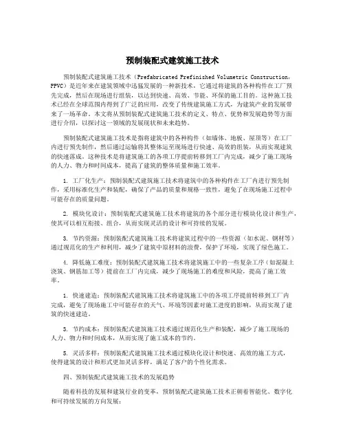 预制装配式建筑施工技术预制装配式建筑施工技术(Prefabricated Prefinished Volumetric Construction,PPVC)是近年来在建筑领域中迅猛发展的一种新技术,它通过将建筑的各种构件在工厂预先完成,然后在现场进行组装,以达到快速、高效、节能、环保的施工目的。