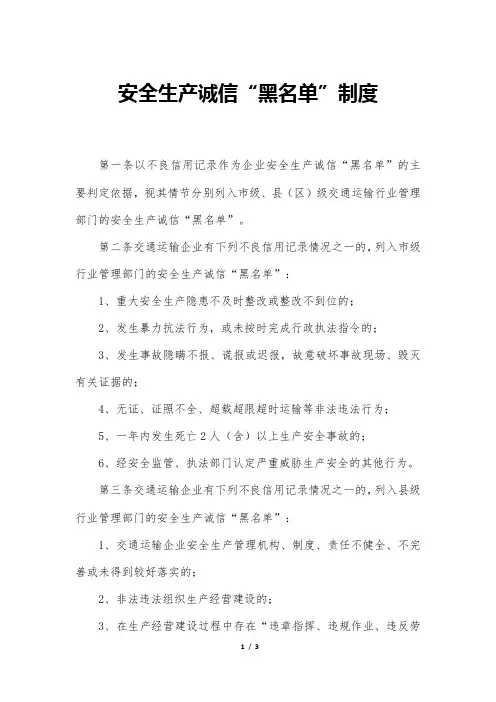 安全生产诚信“黑名单”制度____区____镇安全生产“黑____”管理制度为深入贯彻“安全第一、预防为主、综合治理”的工作方针,进一步落实企业安全生产主体责任,防止和减少生产安全事故,根据安全生产有关法律法规和规定,结合我镇实际工作情况,制定本制度,制定本制度。