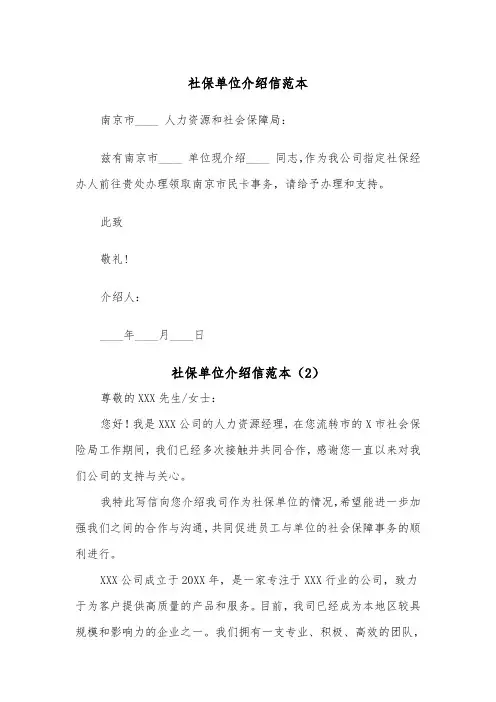 社保单位介绍信范本南京市____ 人力资源和社会保障局:兹有南京市____ 单位现介绍____ 同志,作为我公司指定社保经办人前往贵处办理领取南京市民卡事务,请给予办理和支持。