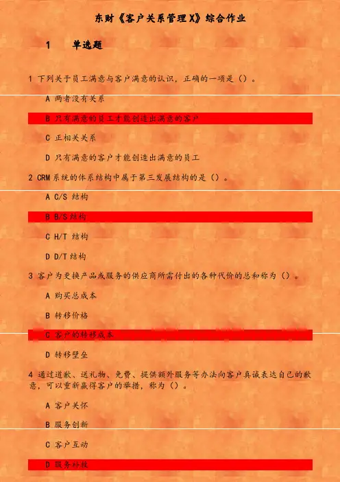 东财《客户关系管理X》综合作业1 单选题1 下列关于员工满意与客户满意的认识,正确的一项是()。