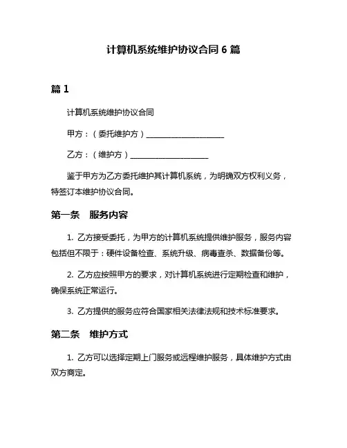 电脑系统维护合同样式6篇篇1甲方(客户):____________________乙方(服务提供商):____________________鉴于甲方需要使用电脑系统并依赖其正常运行进行日常工作,为了保障电脑系统的正常运行和维护,甲方委托乙方提供电脑系统维护服务。