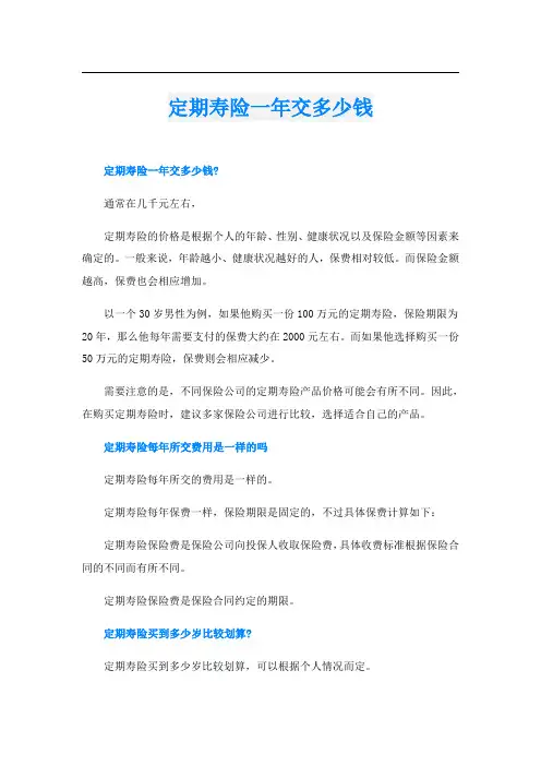 定期寿险一年交多少钱定期寿险一年交多少钱?通常在几千元左右,定期寿险的价格是根据个人的年龄、性别、健康状况以及保险金额等因素来确定的。