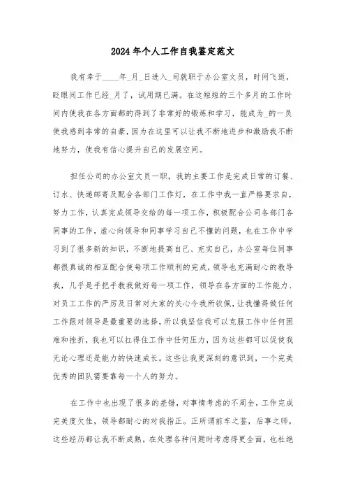 个人工作自我鉴定范文(精选10篇)个人工作自我鉴定范文(精选10篇)自我鉴定是对自己过去某一阶段的学习或工作进行分析,并作出相应的总结,它是增长才干的一种好办法,因此,让我们写一份自我鉴定吧。