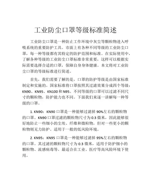 工业防尘口罩等级标准简述工业防尘口罩是一种防止工作环境中灰尘等颗粒物进入呼吸系统的重要防护工具。