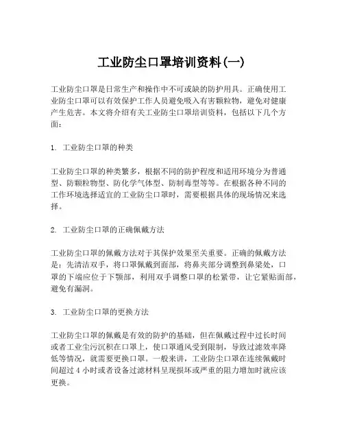 二、防尘面罩的选择1. 根据环境选择合适的防尘面罩不同的环境对防尘面罩的要求也不同。