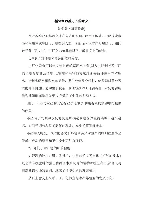 一、循环水养殖技术淡水养殖的内涵和效益1、内涵循环水养殖分为三种类型,半循环模式、全流水循环模式以及封闭循环模式。