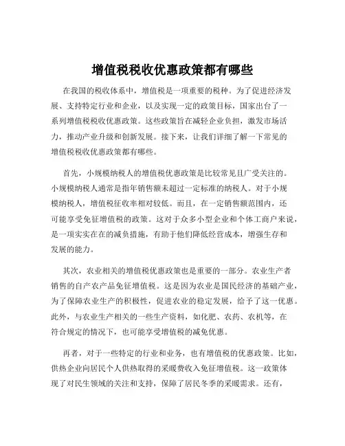 二、特定行业的增值税减免政策1. 农业、林业、畜牧业和渔业在农林牧渔业方面,我国实施了一系列的增值税减免政策。