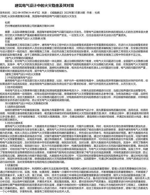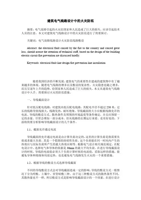 建筑电气线路设计中的火灾防范【摘要】随着我国经济建设和电力事业的不断发展,电在整个国民经济和人民日常生活中起着举足轻重的作用。