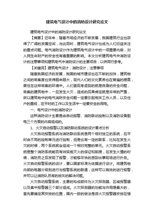 建筑电气设计中的消防设计研究论文建筑电气设计中的消防设计研究论文【摘要】近年来,随着市场经济的不断发展,我国建筑行业也获得了广阔的发展空间,与此同时,建筑电气设计也成为人们日益关注的重点问题。