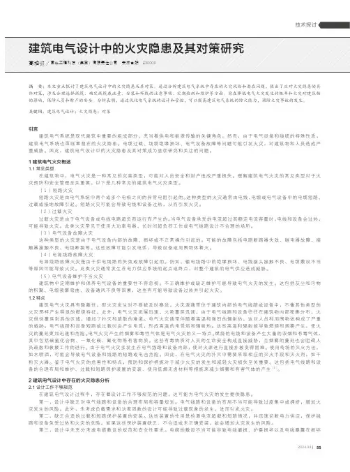 二、建筑电气设计中的火灾隐患建筑电气火灾发生的原因可归为电气设备故障和电气线路故障两大类,造成电气火灾隐含的原因很多,主要有以下4 种,在每种主要原因中也有很多其他因素造成的。