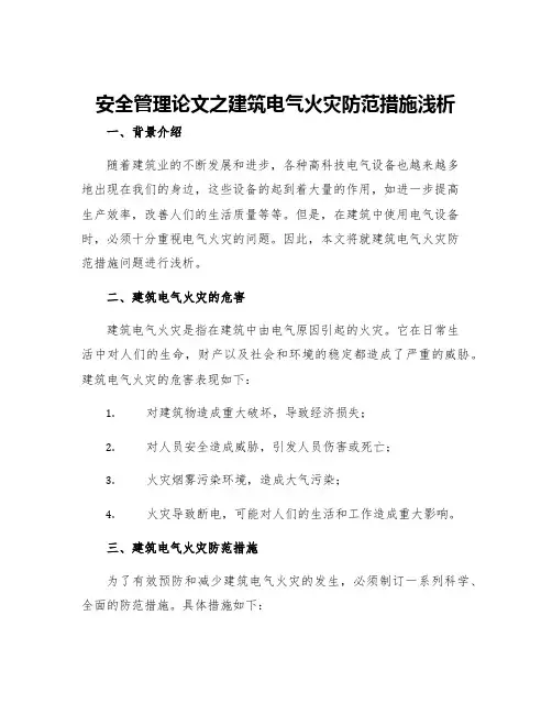一、建筑电气火灾概述建筑电气火灾作为一种灾害,在经济迅速发展的形势下,给国家财产和人民的生命安全造成的损失也与日俱增。