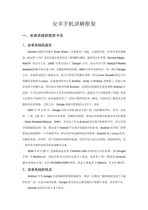 安卓手机讲解框架一、安卓系统的前世今生1、安卓系统的诞生Android的诞生还要从Andy Rubin(安迪鲁宾)说起。