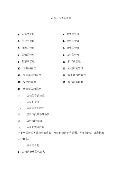 店长工作实务手册、 店长的身份_ 、 店长应有的能力三、 店长不能具备的品质四、 店长天的活动五、 店长的管理权限本手册是帮助各营业店的店长,理解自己的职责范围,并更好的完成店长的工作任务。