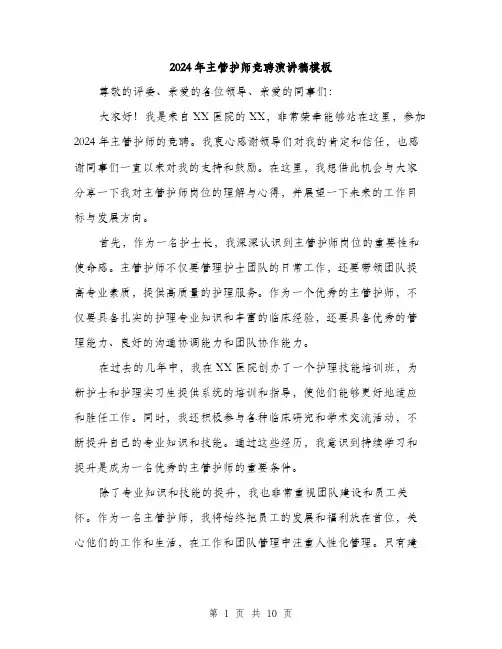 2024年主管护师竞聘演讲稿模板尊敬的评委、亲爱的各位领导、亲爱的同事们:大家好!我是来自XX医院的XX,非常荣幸能够站在这里,参加2024年主管护师的竞聘。