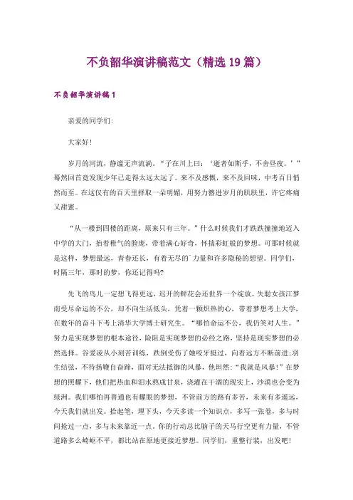 不负韶华演讲稿范文(精选19篇)不负韶华演讲稿1亲爱的同学们:大家好!岁月的河流,静谧无声流淌。