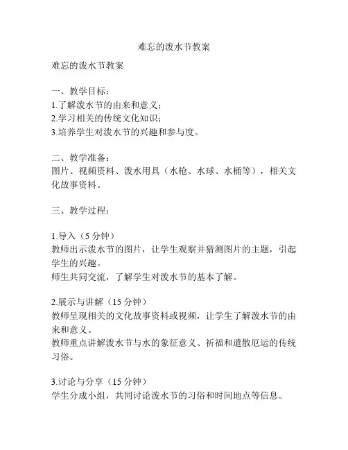 《难忘的泼水节》优秀教学设计教学目标:1.了解泼水节的起源和传统习俗2.学习泼水节的重要意义以及对人们的影响3.培养学生的观察力、想象力和表达能力4.通过实践体验,激发学生的团队合作意识和友爱精神教学过程:第一步:导入(10分钟)1.引导学生讨论关于泼水节的一些常识问题,如:什么是泼水节?泼水节是在哪个国家庆祝的?泼水节的传统起源是什么?2.展示一些泼水节的图片,让学生了解泼水节的大致气氛和场景。