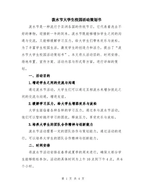 泼水节活动策划方案3篇一、泼水节活动策划方案1. 活动名称:欢乐水战泼水节2. 活动背景:泼水节是中国传统节日之一,也是世界上独特的民俗文化活动,每年都吸引了成千上万的游客前来参与。
