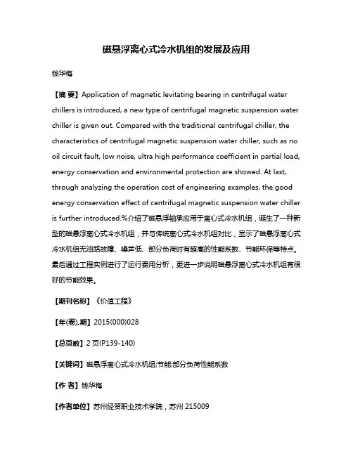 磁悬浮离心式冷水机组的发展及应用钱华梅【摘要】Application of magnetic levitating bearing in centrifugal water chillers is introduced, a new type of centrifugal magnetic suspension water chiller is given out. Compared with the traditional centrifugal chiller, the characteristics of centrifugal magnetic suspension water chiller, such as no oil circuit fault, low noise, ultra high performance coefficient in partial load, energy conservation and environmental protection are showed. At last, through analyzing the operation cost of engineering examples, the good energy conservation effect of centrifugal magnetic suspension water chiller is further introduced.%介绍了磁悬浮轴承应用于离心式冷水机组,诞生了一种新型的磁悬浮离心式冷水机组,并与传统离心式冷水机组对比,显示了磁悬浮离心式冷水机组无油路故障、噪声低、部分负荷时有超高的性能系数、节能环保等特点。