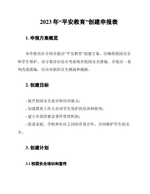 2023年“平安教育”创建申报表1. 申报方案概览本申报旨在介绍并提出“平安教育”创建方案,以确保校园安全和学生保护。