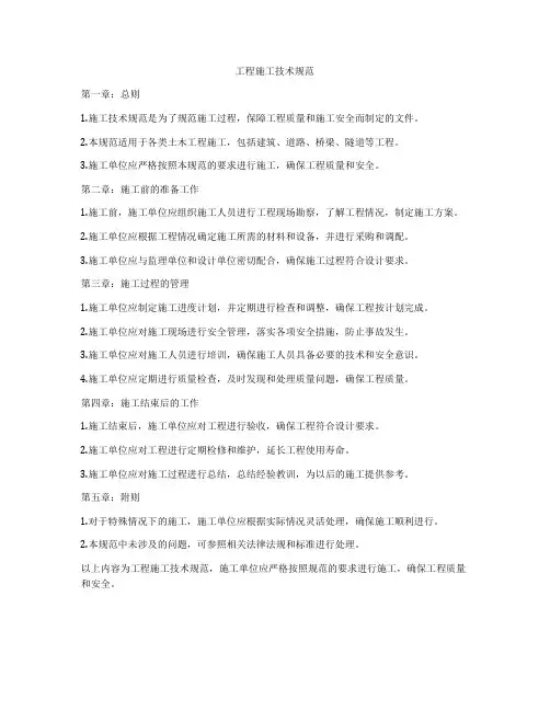工程施工技术规范要求一、总则工程施工技术规范要求是为了保证工程建设质量、安全、进度和投资控制等目标的实现,对施工过程中的技术行为进行规范。