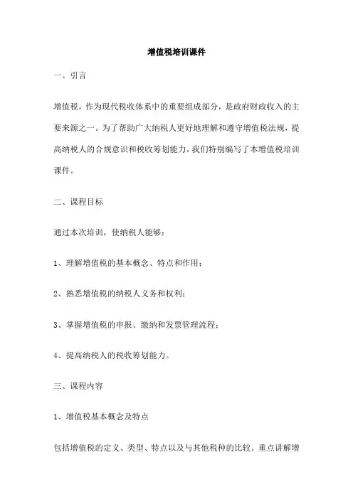 增值税培训课件一、引言增值税,作为现代税收体系中的重要组成部分,是政府财政收入的主要来源之一。