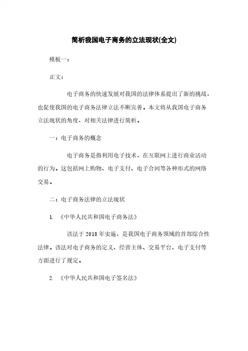 请论述我国电子商务立法现状及你对我国电子商务立法的建议立法现状我国电子商务立法现状及建议1. 简介电子商务是指利用互联网和信息技术进行商业活动的方式,它已经成为我国经济发展的重要推动力量。