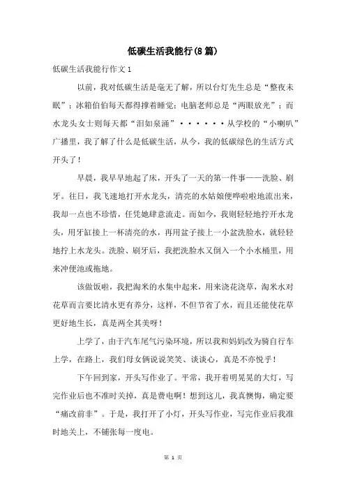 低碳生活从我做起的作文(优秀9篇)低碳生活从我做起作文篇一“低碳生活”已成为我们当今世界的主题,更是我们爱护地球妈妈急需采取的行动!“低碳”就是减少大气中二氧化碳的排放量,减少大气污染,使空气更清新,也就是我们常说的重视环保。